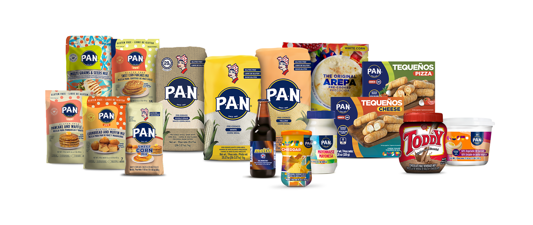 La marca P.A.N. nace en 1960 en Venezuela gracias a la creación de la Harina Precocida de Maíz P.A.N. que rescató la preparación tradicional de las arepas. En la actualidad, P.A.N. es una marca global con un creciente portafolio que incluye harinas, mezclas, congelados, salsas, untables y otros alimentos.